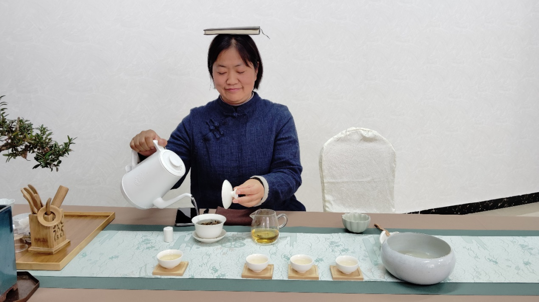 下午,结合“即兴演讲的技巧”、茶礼开展培训。钟老师从PREP、问元芳、否新高、赶过猪四个方法进行讲、学、练、评,教师循循善诱、精确地点评令所有学员倾佩。课程的最后小组以“茶席”为载体,学习“茶礼”,学员们分小组展示泡茶的技巧,通过头顶书本练习站姿、走姿、坐姿、泡茶等一系列的礼仪。